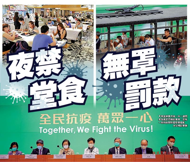 新冠肺炎社区传播速度惊人,政府最新评估社区大规模爆发风险极高。行政长官林郑月娥昨日在召开行会后见记者宣布,本港将於周三(7月15日)凌晨起收紧多项防疫措施,并首次要求食肆晚六朝五不准堂食,只可外卖;强制乘公共交通工具人士要戴口罩,违者最高可被罚款5000元。“限聚令”人数上限进一步收紧至四人,宗教活动群组聚集不再获豁免,海洋公园、迪士尼等主题乐园亦须关闭。政府形容措施是自疫情爆发以来最严厉的防疫安排。