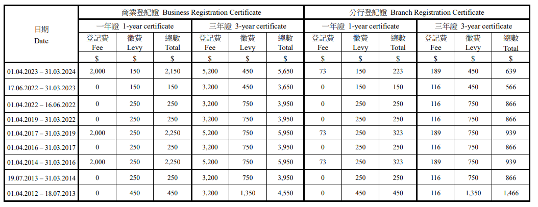商業登記費及徵費收費表 Business Registration Fee and Levy Table